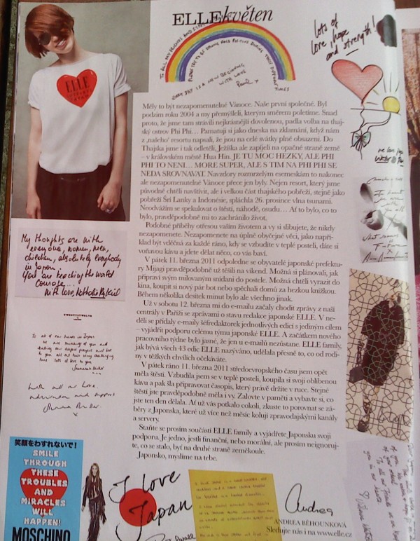 poté následuje úvod od šéfky Elle,kousek vám tu napíšu:"V pátek ráno 11.března 2011 středoevropského času jsem opět měla štěstí .Vzbudila jsem se v teplé posteli ,koupla si svoj oblíbenou kávu a pak šla připravovat časopis,který právě držíte v ruce."