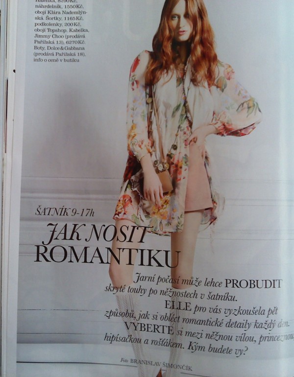 Na fotce:Halenka,8290,-,náhrdelník 1550,- obojí Klára Nademlýnská,šortky 1165,-,podkolenky 200,- obojí Topshop,Kabelka Jimmy Choo(prodává pařížská 13)6270,-,boty Dolce a Gabbana(prodává Pařížská 18)info o ceně v butikuA ted téma :Jak nosit romantku:Jarní počasí může lehce PROBUDIT skryté touhy po něžnostech v šatníku.ELLE pro vás vyzkoušela pět způsobů ,jak si obléct romantické detaily každý den.VYBERTE si mezi něžnou vílou,princeznou,hipísačkou a roštákem.Kým budete vy?