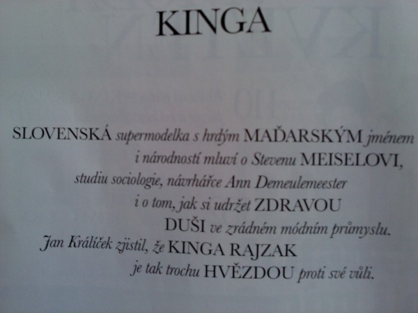 A nyní rozhovor s Kingou Rajzak slovenskou supermodelkou:ELLE:Už jsi vzala modeling a modní průmysl na milostK.R.:Abych pravdu řekla,ano i ne.Obecně s stále připadám dost komicky,když mám zmínit modu nebo modeling jako odpověd na dotaz,co dělám.Vlastně nikdy neříkám,že jsem modelka.Raději odpovím,že jsem studentka.Studenty si totiž daleko víc spojuji s pocitem svobody a volnosti.Ve skutečnosti mají,ale studentský a modelkovský život paradoxně dost společného-hodně práce ,kompromisů a tvrdé dřiny někdy až do hluboké noci.Možná se s pojmenováním modelka nemůžu ztotožnit ,že to lidé mrknutím oka zjednoduší a zaškatulkují si vás do obecného klišé jako"hezká,ale blbá".To slovo jako by bylo infkováno negativními a ambivalentními představami .Vy pak musíte vynaložit docela velké úsilí,abyste takto zkreslenou představu vyvrátila .A to je přesně to ,co na modelingu nemám ráda-tu celou řadu předvídatelných reakcí a to, jak s vám lidé zacházejí,když řeknete"Jsem modelka"Vadí mi fakt,že jsem okamžitě vnímána jako někdo konkrétní v rámci jakési viditelnosti.